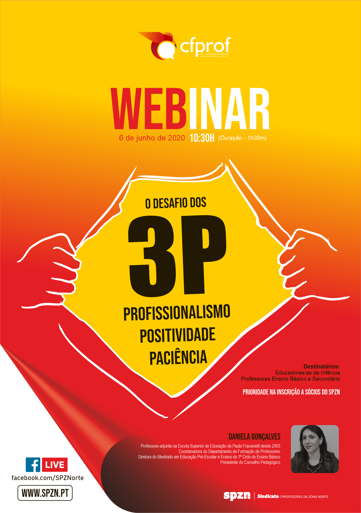 O Centro de Formação Profissional (CFProf) do Sindicato dos Professores da Zona Norte, vai realizar no dia 6 de junho de 2020, pelas 10:30 horas, o webinar "O DESAFIO DOS 3P - PROFISSIONALISMO, POSITIVIDADE E PACIÊNCIA" tendo como palestrante a Professora, Daniela Gonçalves.